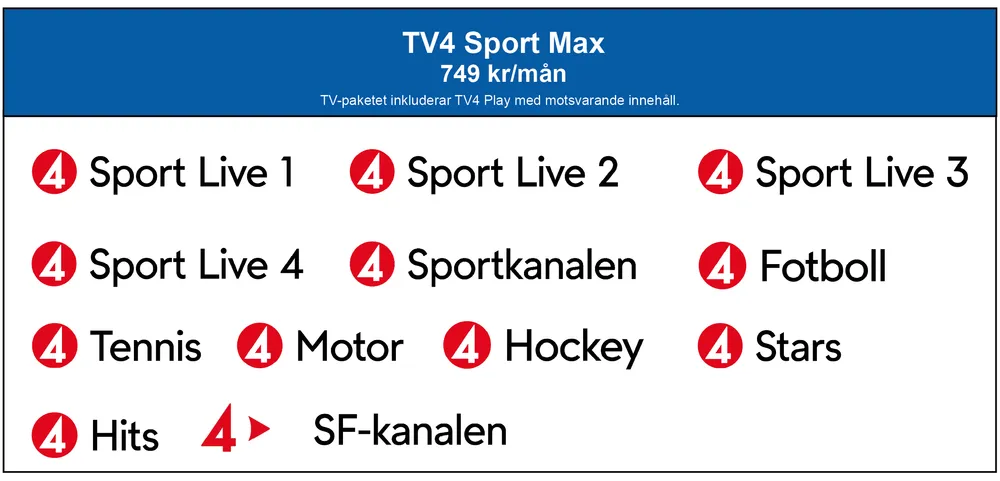 Ett kanalpaket fullspäckat med all sport, alla filmer, alla serier och all underhållning som TV4 har att erbjuda – helt utan avbrott. Det här är paketet som levererar Sveriges bästa sport med alla matcher från SHL och HockeyAllsvenskan. Dessutom fotboll i världsklass med alla matcher från UEFA Champions League, LaLiga och Serie A. Genom våra egna sportkanaler kan du bl.a. följa ishockey, fotboll, tennis, rally, amerikansk fotboll och världens bästa basketliga och mycket, mycket mer.